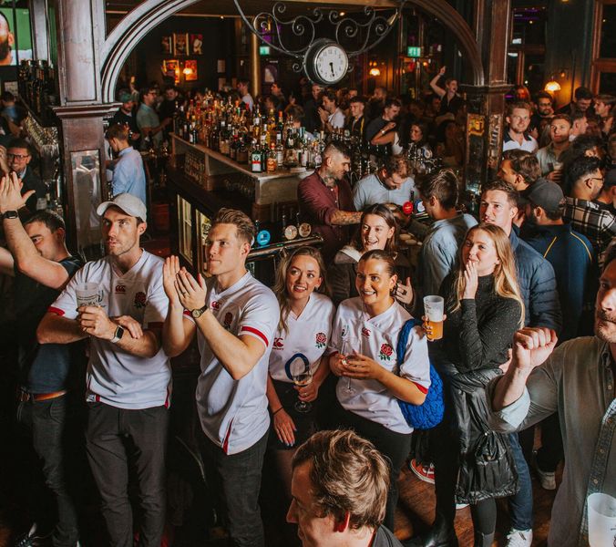 Rugby fans in white jerseys applaud, surrounded by a lively pub crowd at a bar.